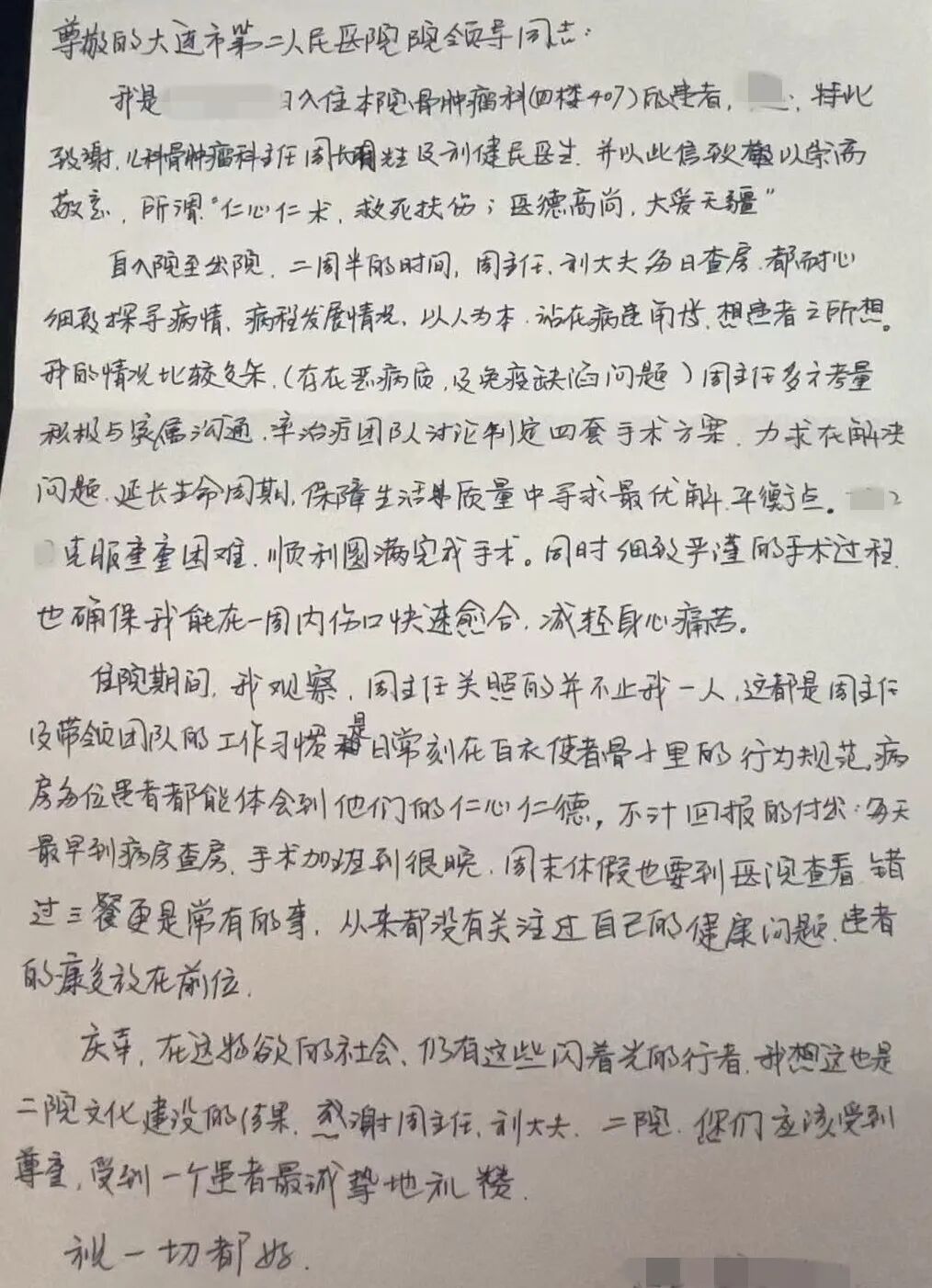 近年来,大连市第二人民医院始终以患者需求为导向,紧紧围绕“就诊流程标准化、诊疗行为规范化、医疗服务优质化”的工作要求,提升医疗质量,努力为每一位患者提供安全、温暖、高效的诊疗体验。近日,我院小儿与骨肿瘤科收到了一封真挚感谢信,生动诠释了“三化”服务背后深深的人文关怀,更讲述了一段医护人员助力他圆满参加女儿婚礼的暖心故事。