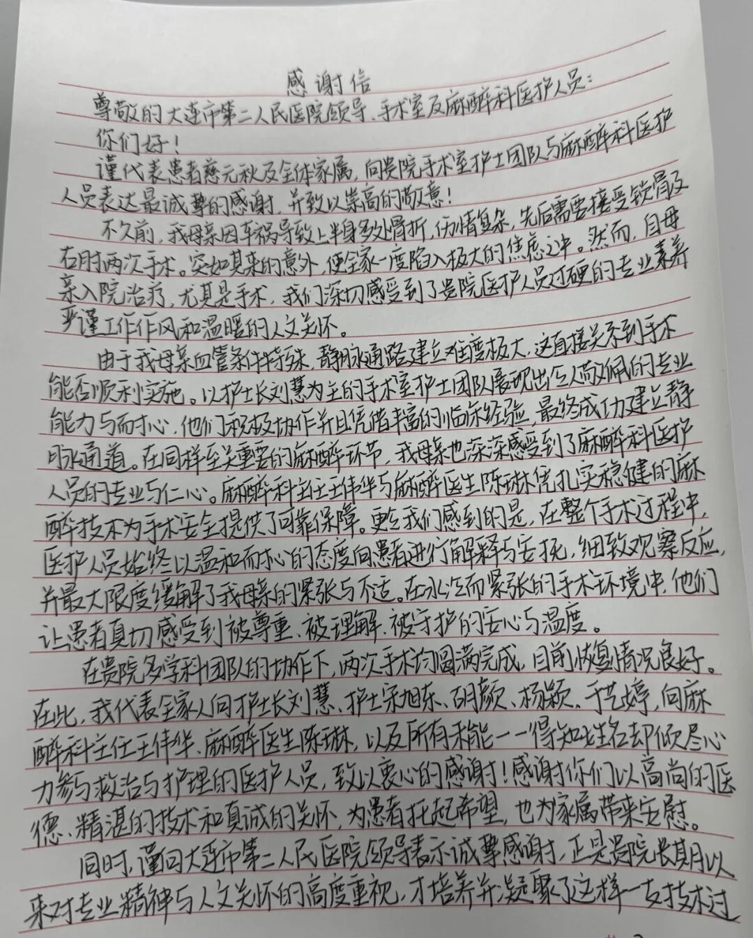 术后,家属提笔致谢,深情致敬每一位为生命默默付出的医护人员。