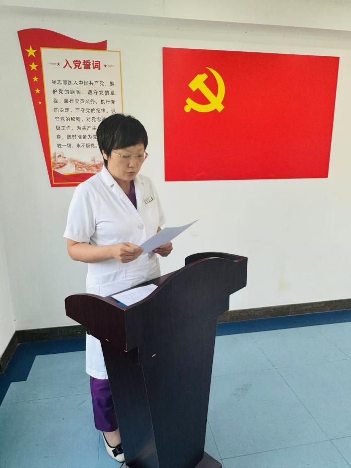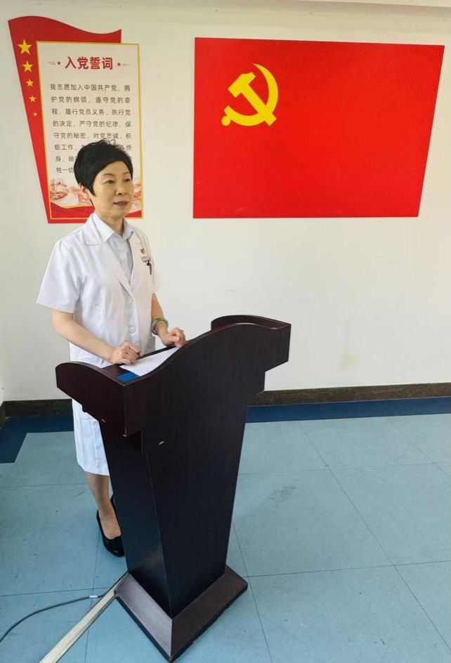 预备党员代表马秀宁发言表态。作为医院泌尿内科(肾病科)学科带头人,她回顾了自己的入党历程,并分享了在学习和生活中对党的认识和感悟。她表示加入党组织是个人成长道路的重要节点,也是新的起点,自己将终生铭记这一时刻,自觉接受党组织的教育、管理和监督,不断提高自身的政治素养和业务能力。在学习和工作中发挥先锋模范作用,为医院高质量发展和健康大连建设贡献自己的力量。