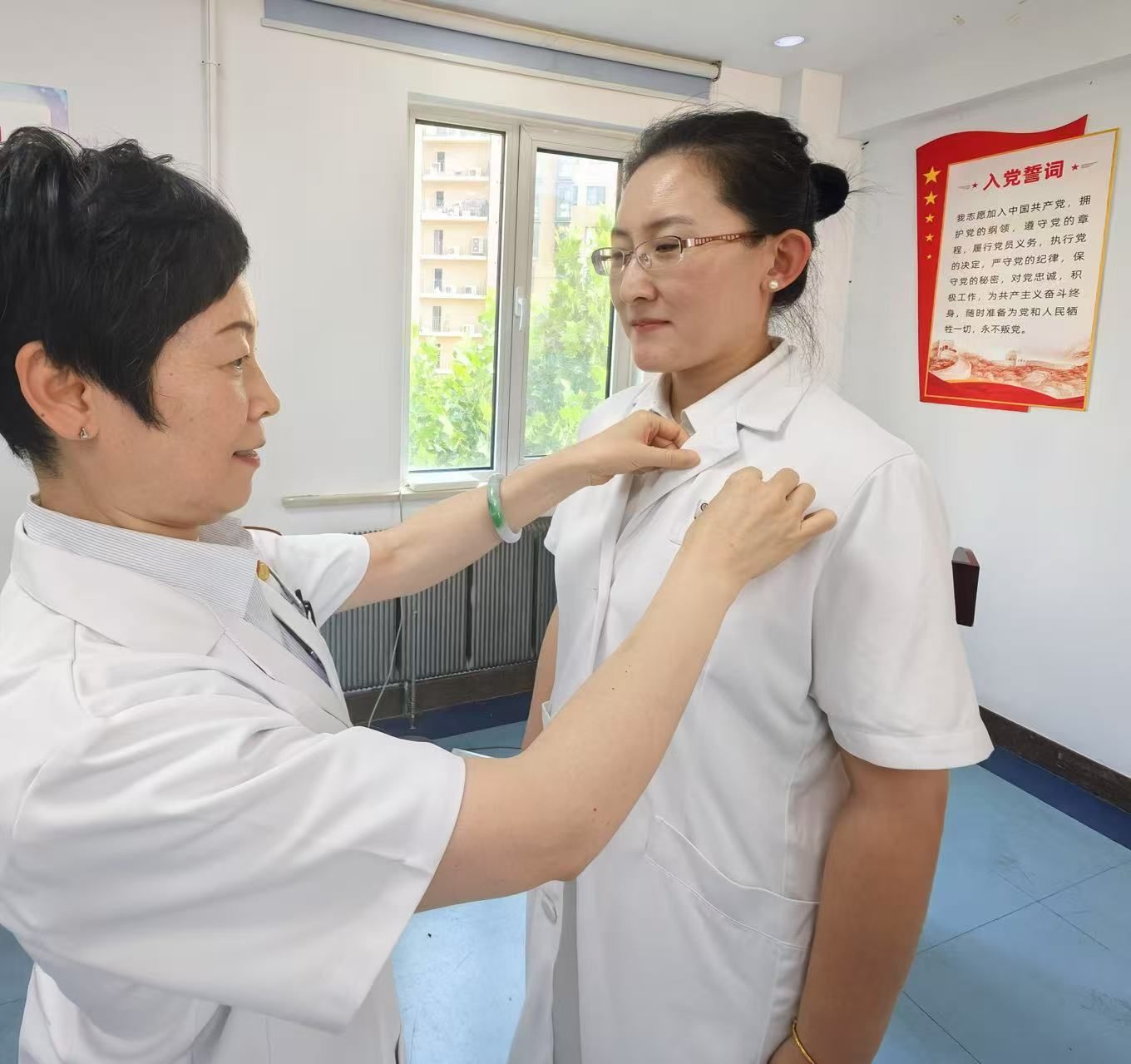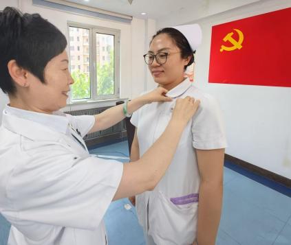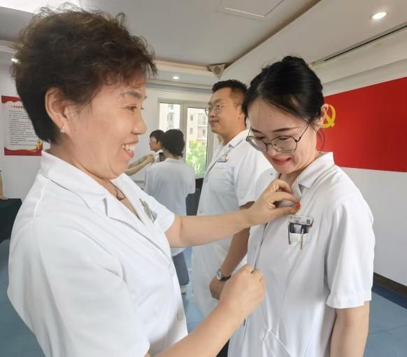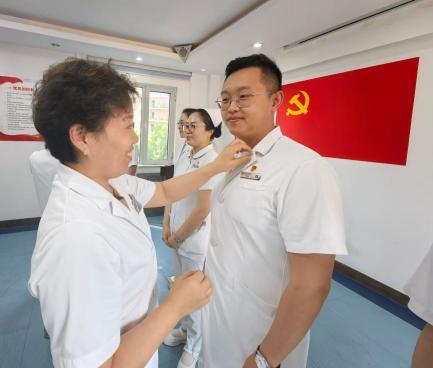 首先,党群部主任刘璐佳宣布新接收预备党员名单。医院党委书记刘威、纪委书记朱旭芳为5名新发展党员佩戴党员徽章。